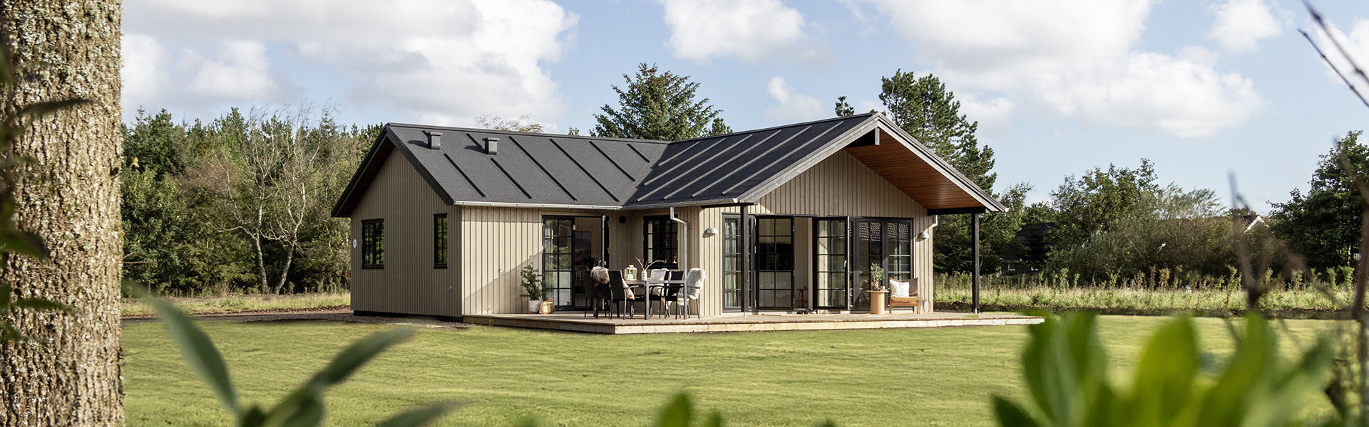 Nova Idyll vinkelhuset er et af vores mest populære sommerhuse med et dejligt overdækket loungeområde og en hyggelig terrassekrog til grill og udendørs spisning.