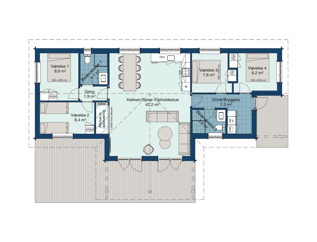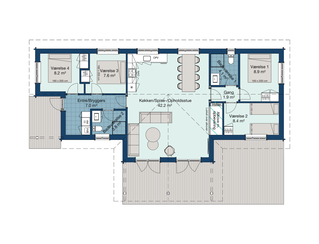| Faciliteter | Overdækket terrasse, alkove, ekstra badeværelse |