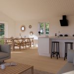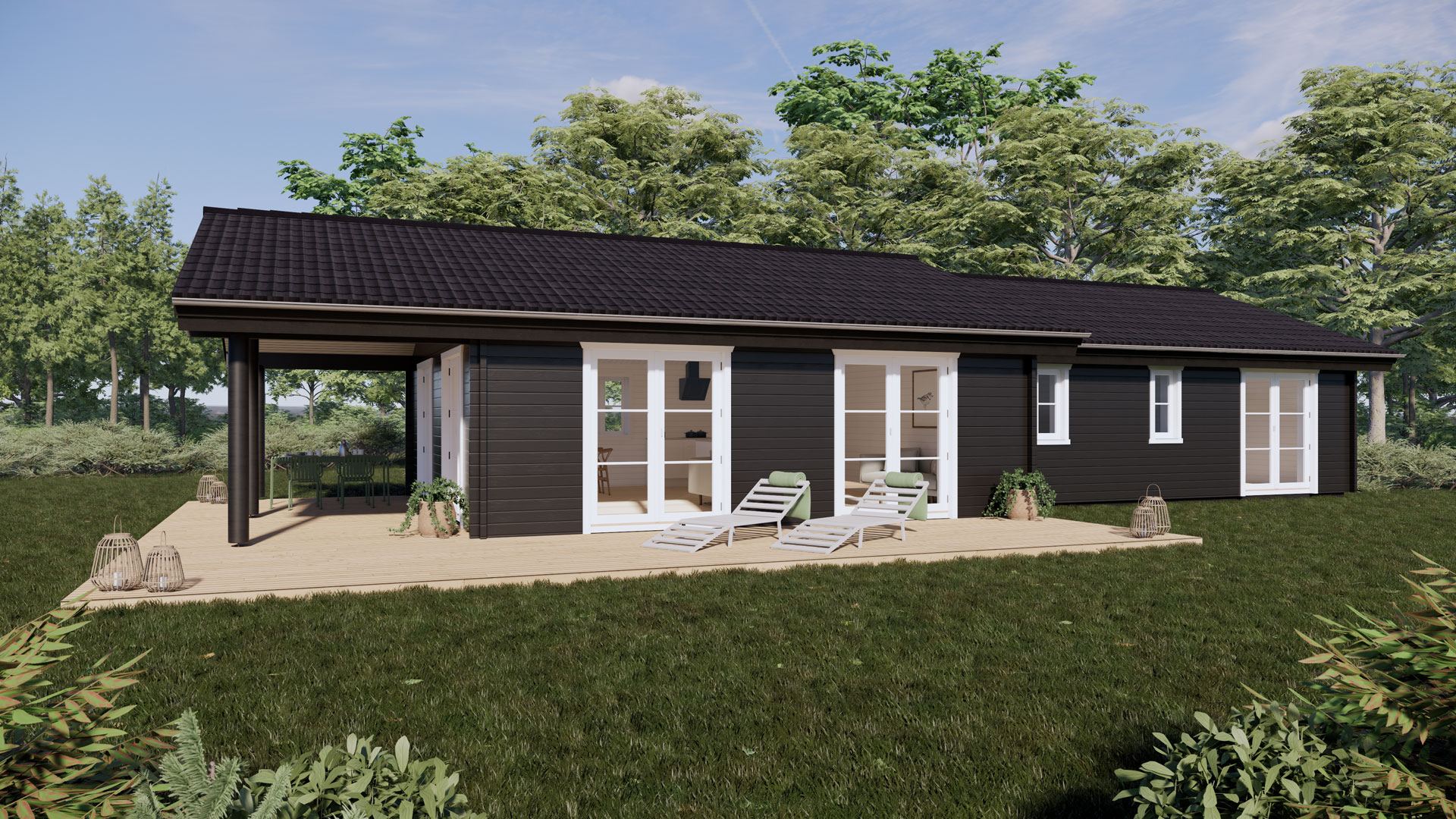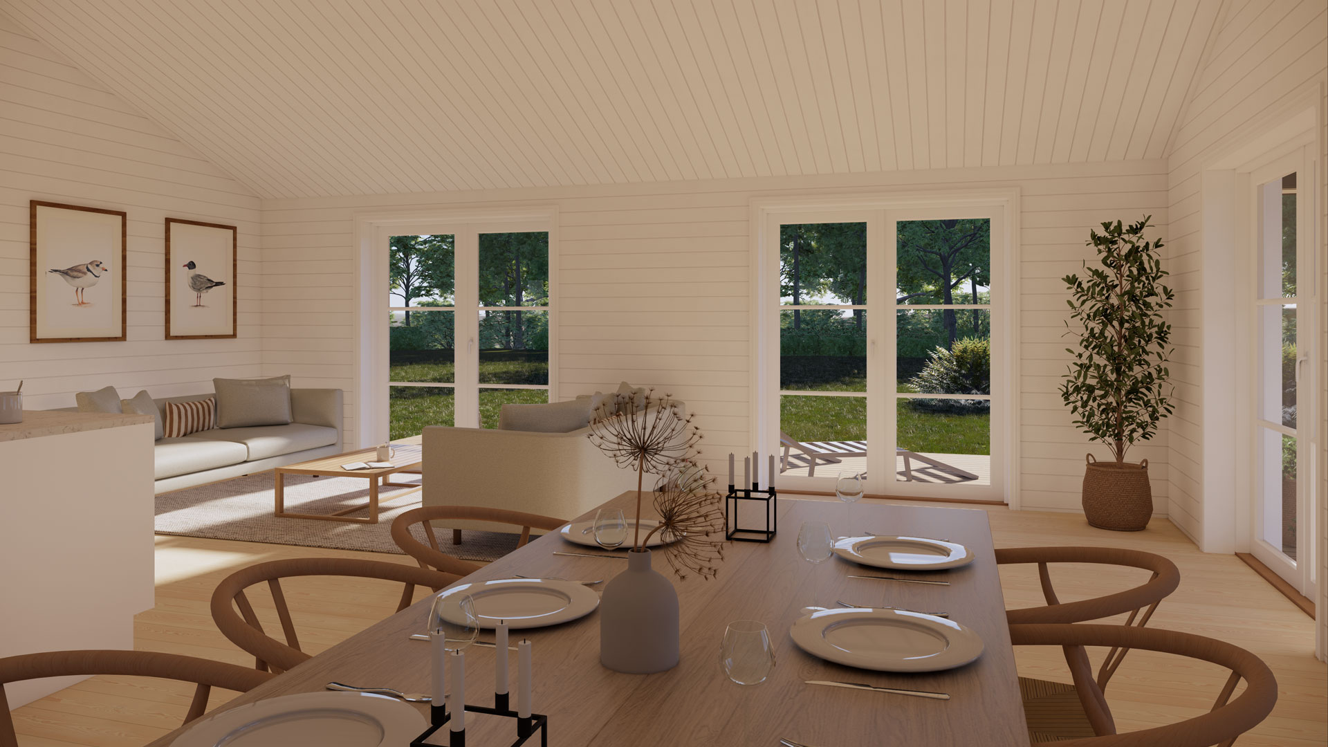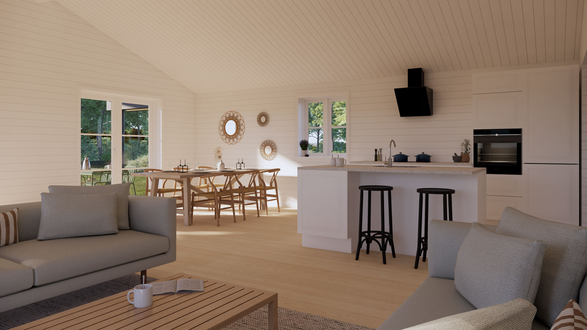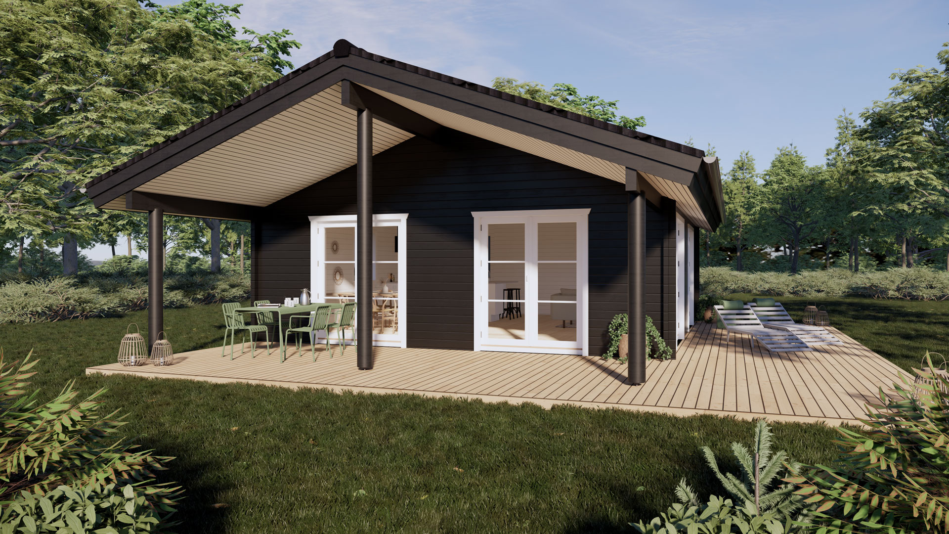 Prisen for et færdigbygget sommerhus, inkl. arkitekthonorar, tegninger, statiske beregninger, ansøgning om byggetilladelse, projektstyring, tæthedstest (Blowerdoor-test) samt byggestyring frem til indflytning. Ekskl. byggeforberedelsespakke.