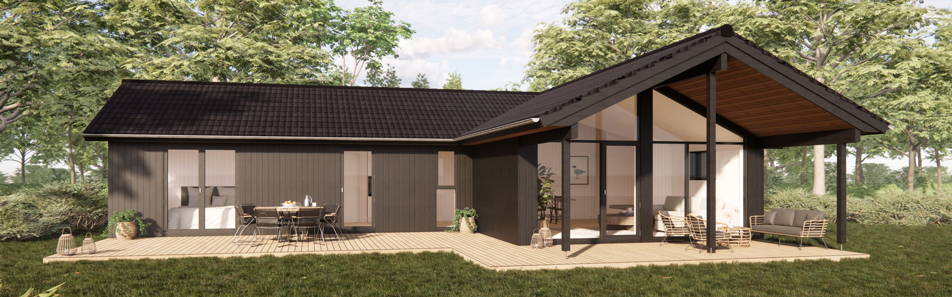 Dette moderne sommerhus på 125 m² forener kvalitet, funktionalitet og ægte sommerhusstemning til en attraktiv pris. Den vinkelbyggede arkitektur skaber et naturligt uderum med en overdækket terrasse – perfekt til afslapning og hyggelige stunder i det fri. Et stort vinduesparti i gavlen lader lyset strømme ind og giver stuen en luftig og indbydende atmosfære.