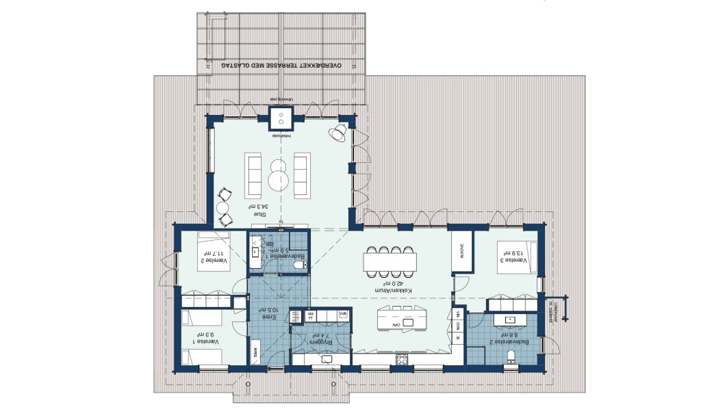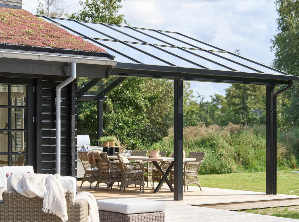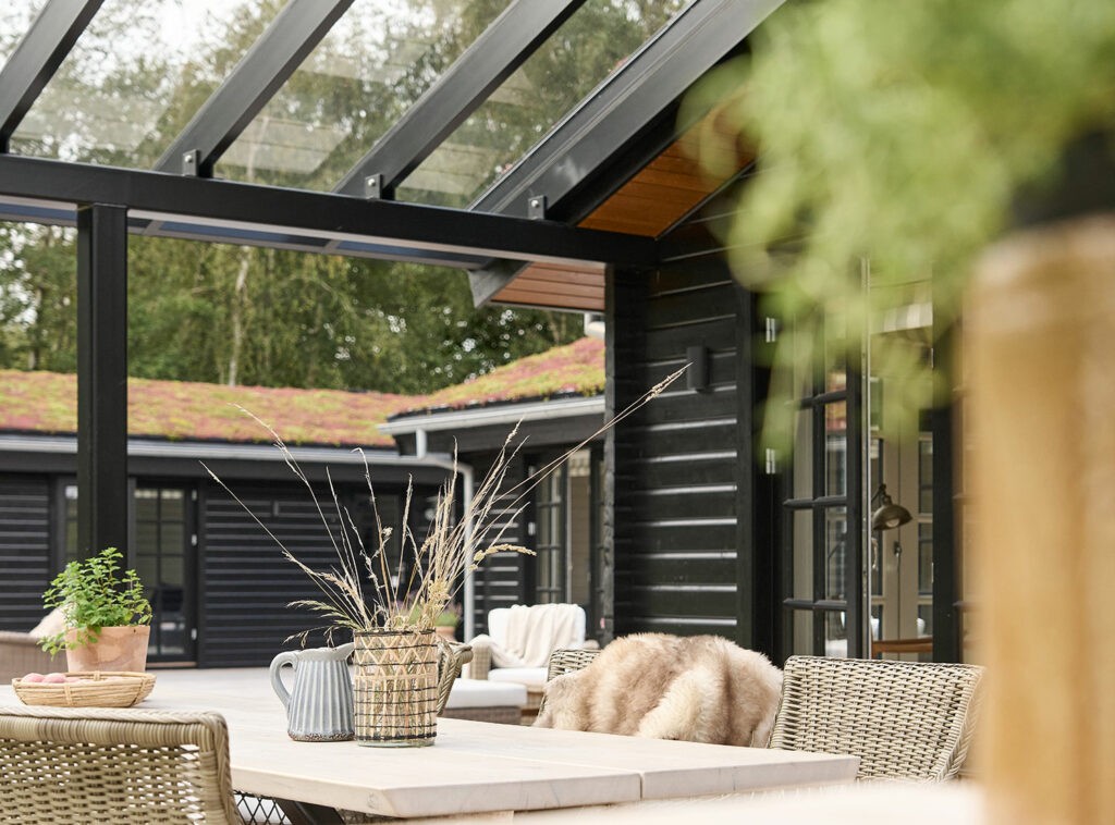 Træd ud på terrassen. Natten er stille, kun afbrudt af den sagte knitren fra pejsen. Gennem det glasoverdækkede tag åbner himmelrummet sig – et panorama af stjerner, der minder jer om, hvorfor I valgte netop dette sted.