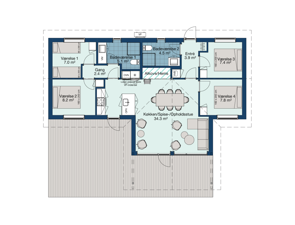Merkur-huset byder på fire gode soveværelser, to flotte badeværelser og en praktisk entré med plads til overtøj og sko. Midt i huset ligger den hyggelige alkove, perfekt til en lur eller som ekstra hyggekrog. Over alkoven finder du en hems, som børnene vil elske som legeområde eller ekstra soveplads.