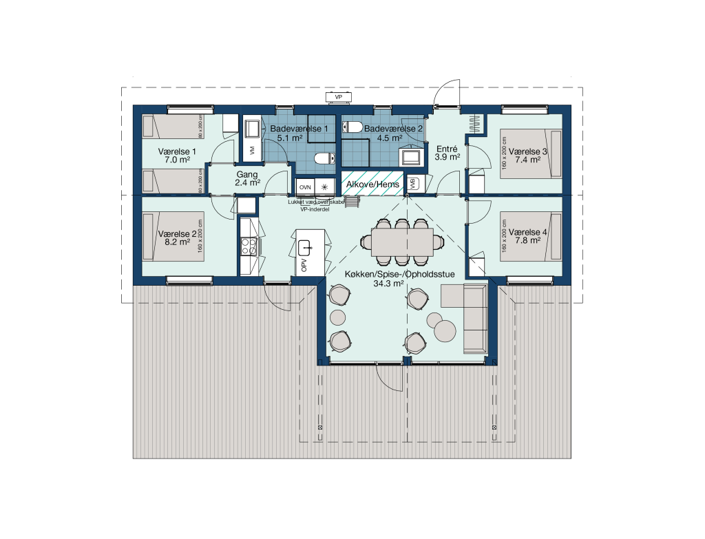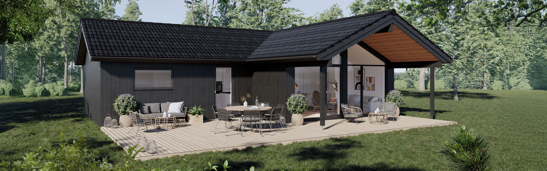 Merkur 114/97 er skabt til jer, der drømmer om et feriehus med plads til både nærvær, gæster og afslapning. Her flyder lys og luft naturligt ind gennem det store gavlparti, som åbner det flotte opholdsrum mod terrassen og naturen udenfor. Den rummelige spiseplads og det åbne køkken gør det let at samles – både til lange middage, brætspilsaftener og stille morgener med duften af kaffe.