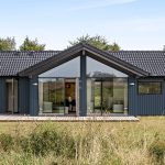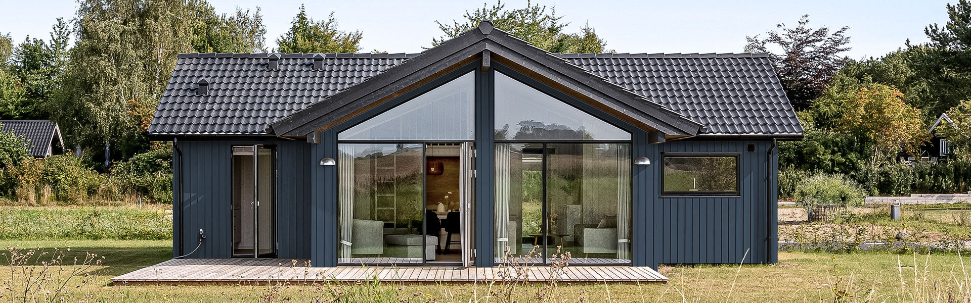 Indflytning forventes i 2026. Billederne viser et lignende sommerhus. Sommerhuset bliver opført i en mørk blå/grå facadefarve.