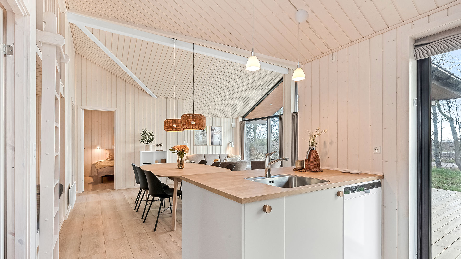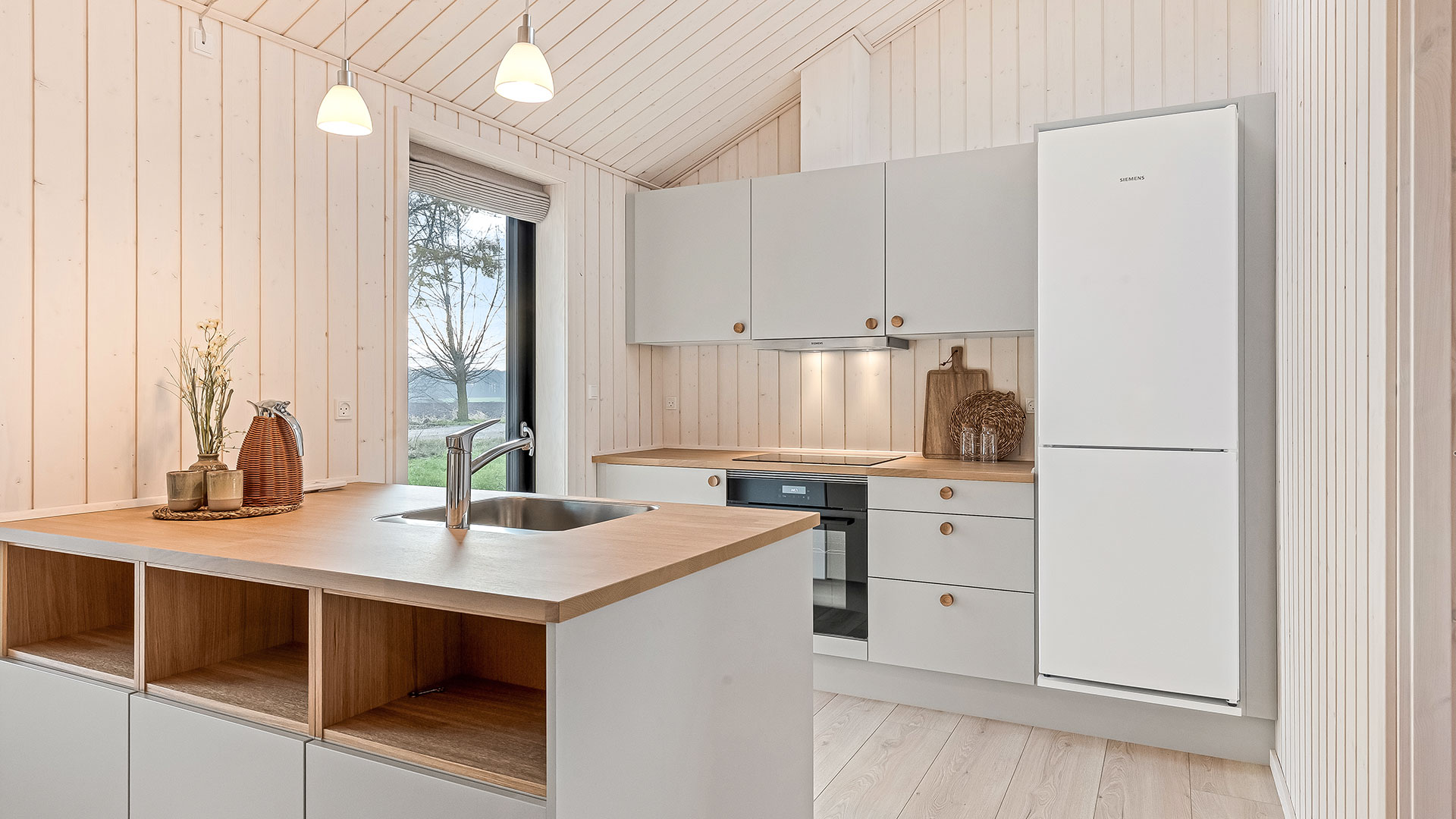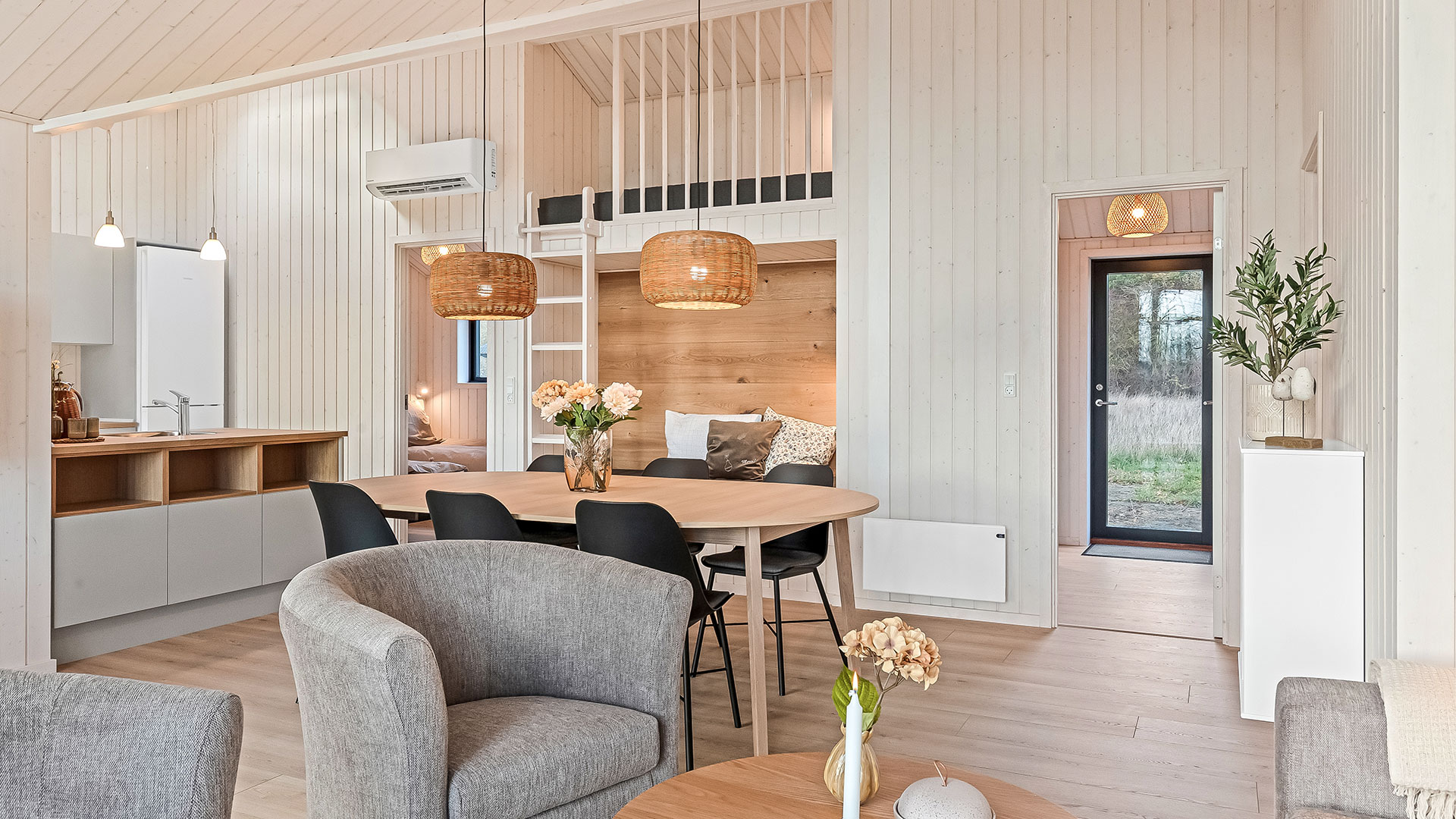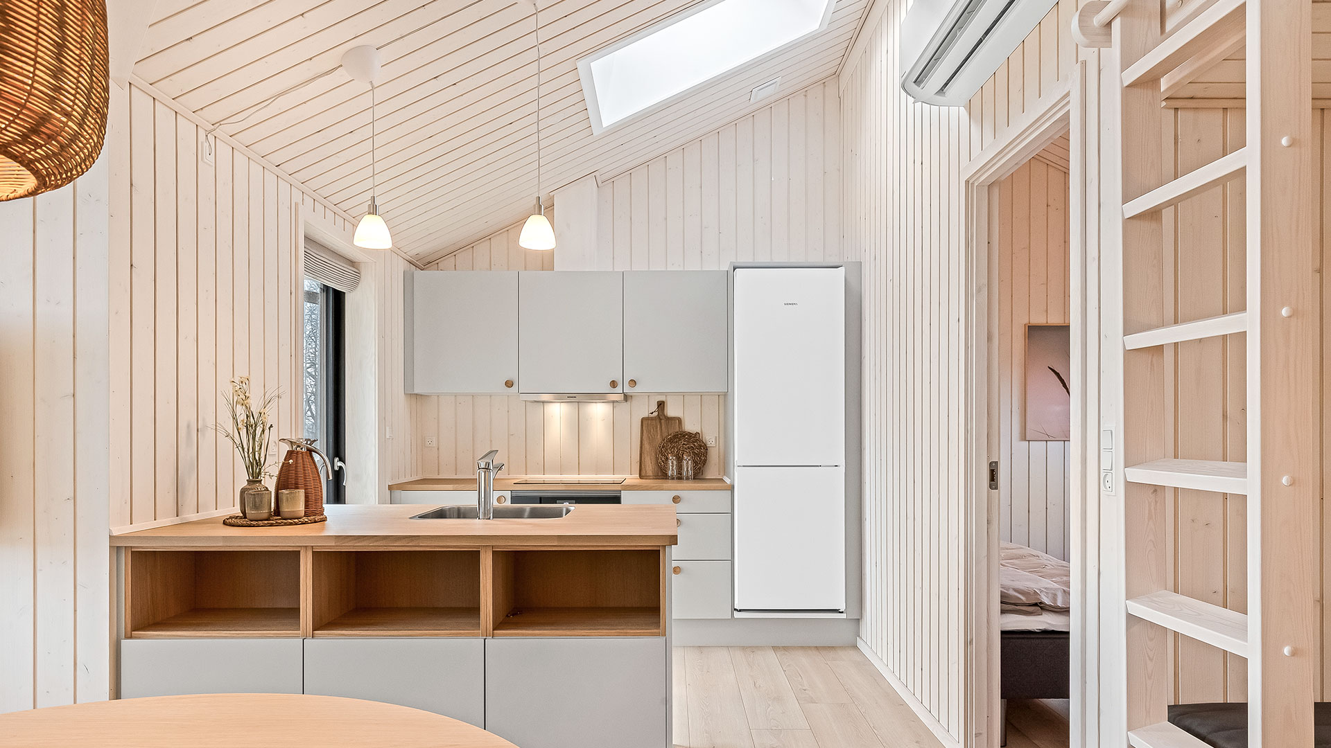 Merkur 90/80 er et rummeligt og lyst sommerhus, skabt med fokus på fællesskab og komfort. Hjertet af huset er det store opholdsrum, hvor køkken, spiseplads og stue smelter sammen i ét. Lyset strømmer ind gennem de store gavlvinduer og ovenlyset i køkkenet, og både stue og køkken har direkte adgang til den dejlige terrasse – hvoraf en del er overdækket. Her er tre gode soveværelser, en hyggelig alkove med hems – perfekt til leg og overnattende gæster – samt et praktisk badeværelse med vaskemaskine. Huset leveres møbleret med sans for både æstetik og funktionalitet – klar til at nyde med det samme.