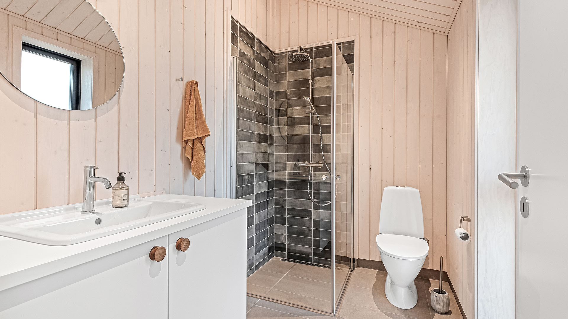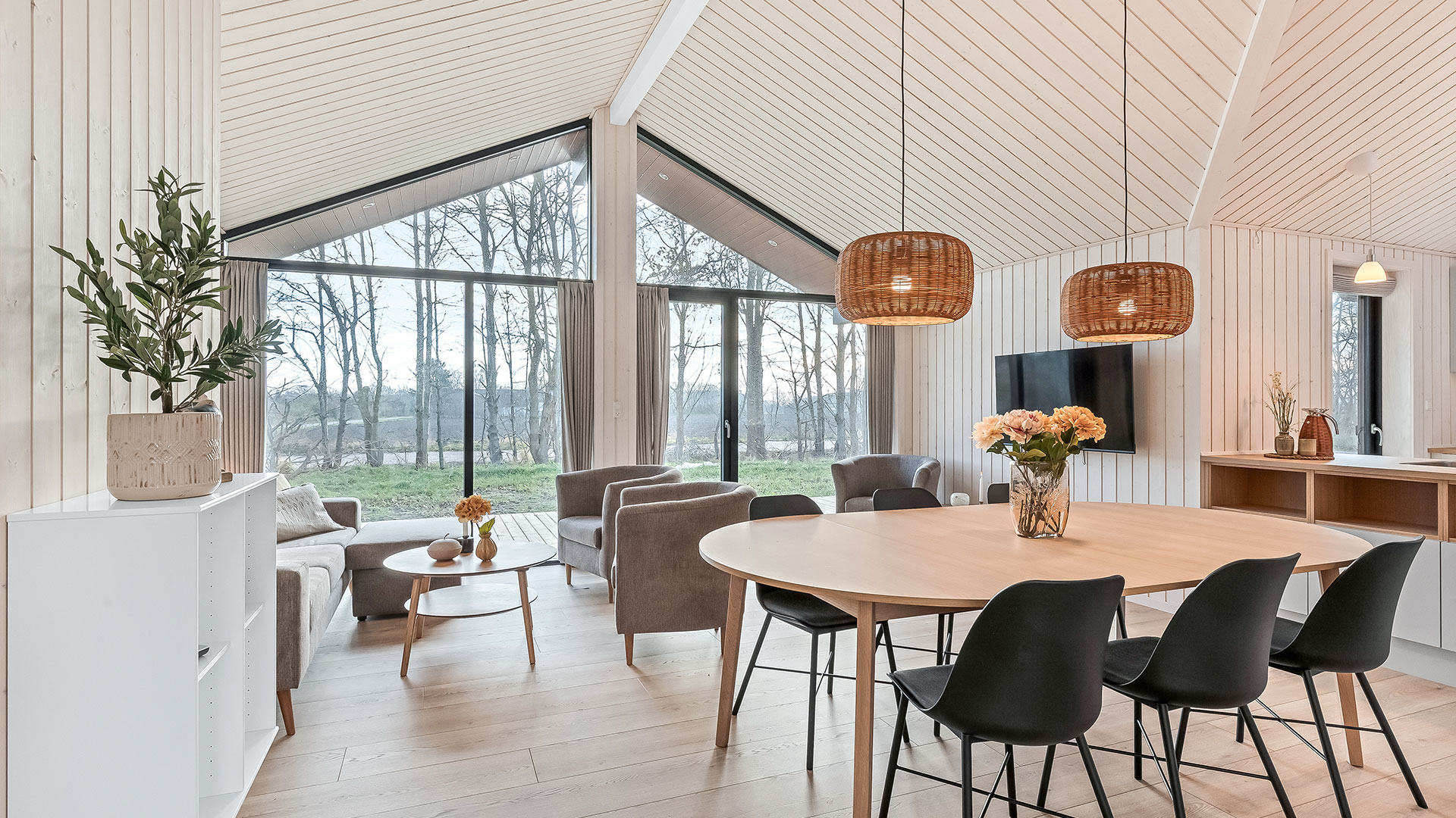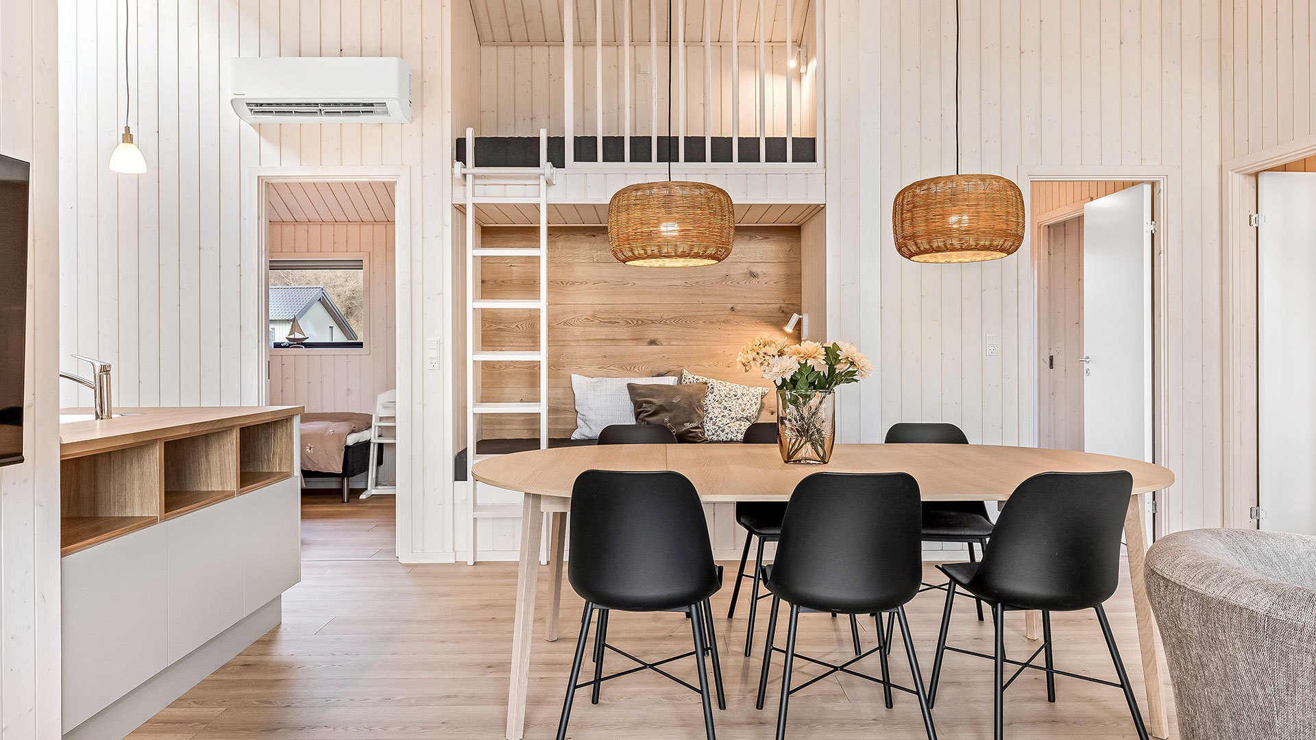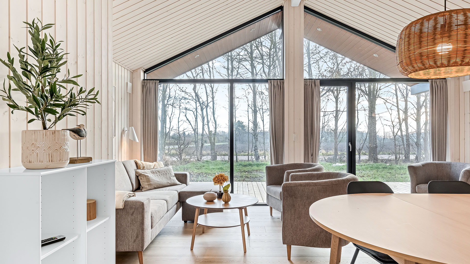 Merkur 90/80 er et rummeligt og lyst sommerhus, skabt med fokus på fællesskab og komfort. Hjertet af huset er det store opholdsrum, hvor køkken, spiseplads og stue smelter sammen i ét. Lyset strømmer ind gennem de store gavlvinduer og ovenlyset i køkkenet, og både stue og køkken har direkte adgang til den dejlige terrasse – hvoraf en del er overdækket. Her er tre gode soveværelser, en hyggelig alkove med hems – perfekt til leg og overnattende gæster – samt et praktisk badeværelse med vaskemaskine. Huset leveres møbleret med sans for både æstetik og funktionalitet – klar til at nyde med det samme.