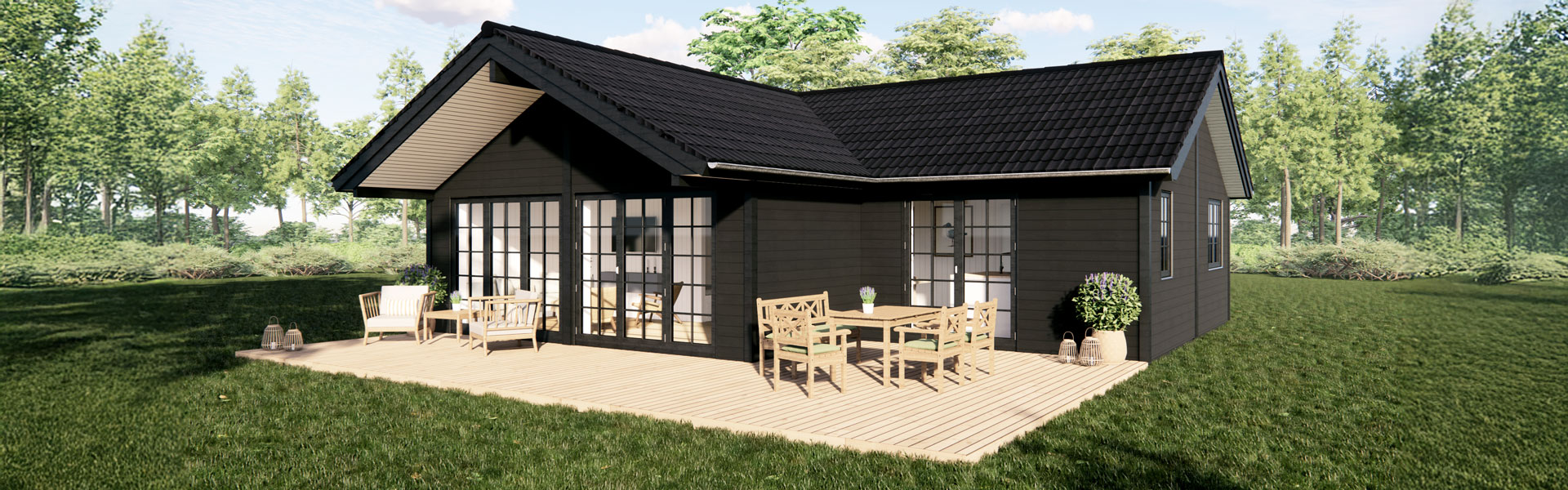 Nova Idyll vinkelhuset er et af vores mest populære sommerhuse med et dejligt overdækket loungeområde og en hyggelig terrassekrog til grill og udendørs spisning.