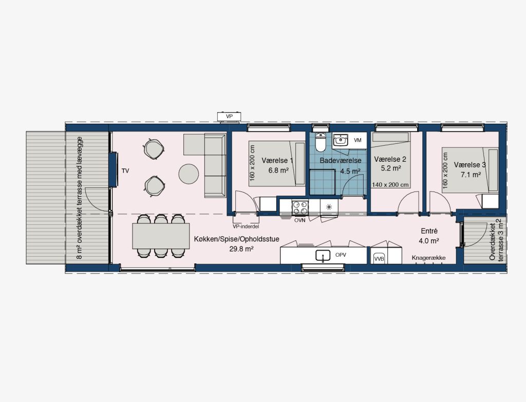 Eris 81/70 danner rammen om afslappende ferier og gode stunder året rundt. Boligen byder på tre separate værelser og plads til hele familien eller overnattende gæster. Det centrale samlingspunkt er det store opholdsrum med integreret køkken og spiseplads, hvor der er tænkt i både lys og åbenhed. De brede vinduespartier skaber en naturlig forbindelse mellem inde- og udeliv og giver rummet en lys og luftig stemning.